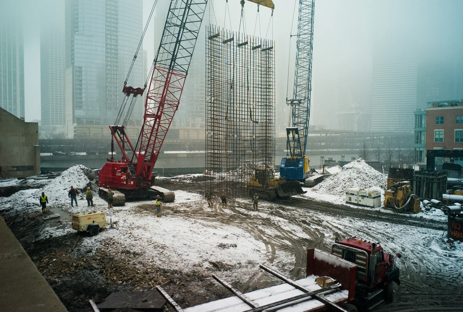 Perhaps no construction project over the last five years in the United States symbolizes our great economic collapse than that of the 2000 foot tall Chicago Spire designed by Santiago Calatrava. A short time from now the 1500 or so condominiums in the building were to have been sold and occupied over the course of the next year or two until the the financial world changed, credit dried up and the real estate markets all but collapsed. I was fortunate enough to know the developer Garrett Kelleher, and asked him if I could make a photographic record from the start to finish of his massive work and he agreed. What you see on this page of thumbnails does not in any way do justice to the scope and breadth of what was to be the tallest and potentially most spectacular modern architecture built in years in the United States. Image (#2) is the model in Garrett's office photographed on May 24, 2007, then in (#9) in September of 2007 we see the simple piece of steel with the vertical line on it which represents the very center of the great circular core of the structure. Image (#17) in early 2008 takes us down into the 100 foot deep center core hole, where the workers appear as tiny specs and finally in the last image (#32), after hundreds of millions of dollars spent, the abandoned site with its simple core hole as seen on August 25, 2008, with the just completed 94 story Trump Tower in the background. The saddest image for me is (#30), the green rectangle painted on the side of the very last deep caisson with the thoughts of all the workers and people involved in bringing this work so far along. They had such high hopes.